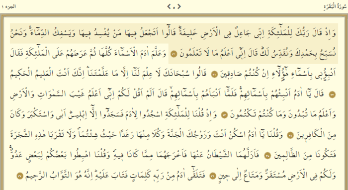 Ve iz kale rabbüke lil melaiketi innı caılün fil erdı halıfeh* kalu e tec'alü fıha mey yüfsidü fıha ve yesfiküd dima'* ve nahnü nüsebbihu bi hamdike ve nükaddisü lek* kale innı a'lemü ma la ta'lemun