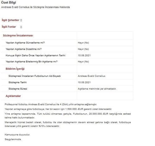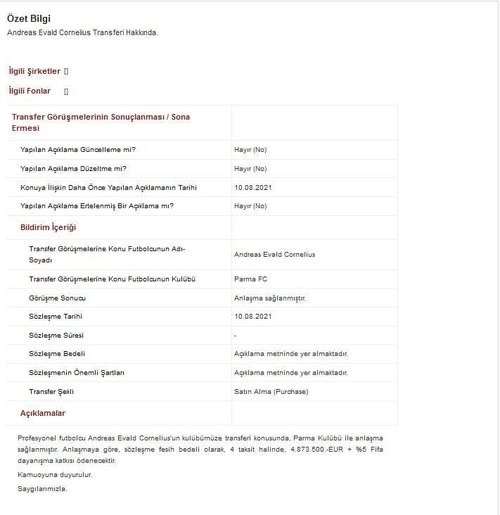 Profesyonel futbolcu Andreas Evald Cornelius'un kulübümüze transferi konusunda, Parma Kulübü ile anlaşma sağlanmıştır. Anlaşmaya göre, sözleşme fesih bedeli olarak, 4 taksit halinde, 4.873.500.-EUR + %5 Fifa dayanışma katkısı ödenecektir.
