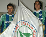 İmza töreni sonunda Zafer Biryol ve Görkem Gör, Çaykur Rizespor bayrağıyla basın mensuplarına poz verdiler.