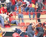 Derbi öncesi tribünlerde kavga çıktı. G.Saraylı taraftar polisle çatıştı, polis biber gazı kullandı, koltuklar kırıldı.