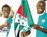 Bursaspor, Gineli Cisse Muhamed Lamine ile Kamerunlu Emo Ghislain Aime'yi renklerine bağladı. Dün Vakıfköy Orhan Özselek Sosyal Tesisleri'nde düzenlenen törende Cisse 1 artı 2, bir yıldır altyapıda idmana çıkan Emo da 5 yıllık sözleşmeye imza attı. Büyük bir camiaya geldiğinin farkında olduğunu belirten Cisse, "Başarı
