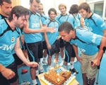 SOL dizinden operasyon geçiren F.Bahçeli Gökçek Vederson'a sürpriz doğum günü morali. 22 Temmuz 1981 doğumlu olan Vederson için özel bir pasta hazırlatan futbolcular, idman öncesi kutlama yaptı. Vederson ve Deivid'in kutlamaya koltuk değnekleriyle katılması dikkat çekti.