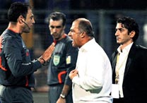 _Hakemin yönetimiyle ilgili neler söyleyeceksiniz? Maçtan sonra Terim, hakeme yüklendi. Bizim hakemlere dümdüz gidiyorsun, elle, ayakla, tekmeyle, tükürükle gidiyorsun. Bursa maçında Kazım tükürdü. Hakemin aleyhine verdiği karardan sonra tükürdü. Sorarsan, 'Yere tükürdüm' diyecek. Yok ya!.. Sen benim aleyhime karar veriyorsun, ben senin yüzüne bakarak tükürüyorum yere. Kime tükürülmüş olur o zaman! Belli her şey. Ama biz de bunlar cezasız kaldığı için adam zannediyor ki Avrupa'da da yaparım. Ben o stadyumda yoktum, spikerden dinliyorum, maçın başından itibaren, dördüncü hakem Fatih Terim ile uğraşıyor. Spiker 'Dördüncü hakem Fatih Terim'in yanında" dedi sürekli. Eeee!..
