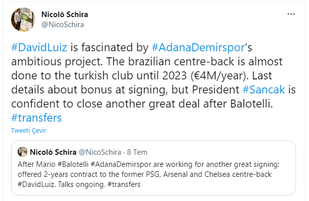 Öte yandan haberde, David Luiz'in, Adana Demirspor'un kendisine yönelttiği projeye hayran kaldığı ifade edildi. Oyuncuya yıllık 4 milyon euro maaş verileceği de aktarıldı.