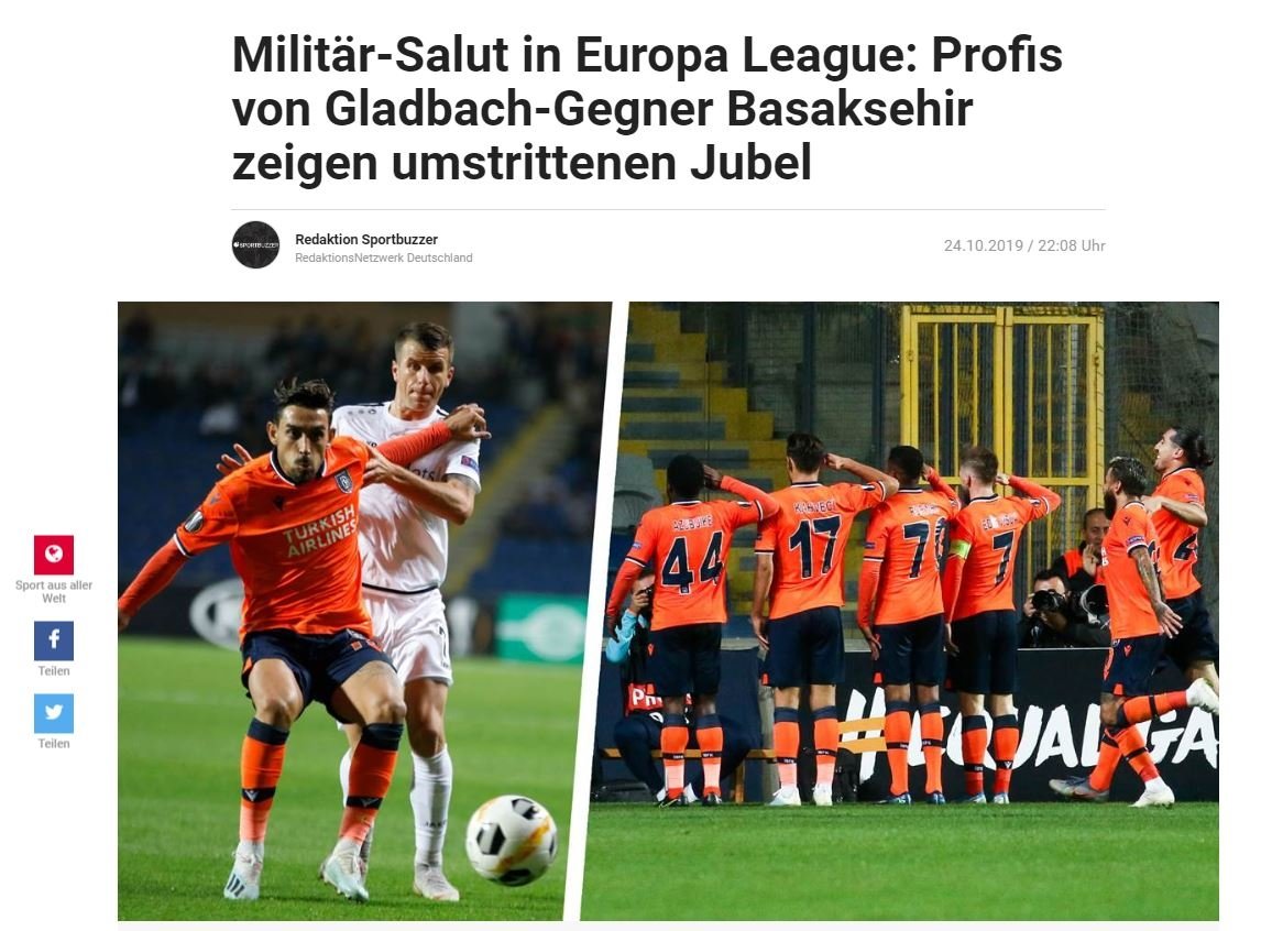 UEFA Avrupa Ligi'nde Avusturya ekibi Wolfsberger'i 1-0 mağlup ettiği mücadelede asker selamı veren Başakşehirli futbolcular Alman basınında gündem oldu.