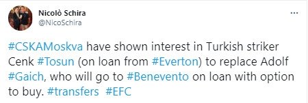 Ünlü gazeteci Nicolo Schira'nın haberine göre CSKA Moskova, Cenk Tosun'u kiralamak istiyor. CSKA'nın kadrosunda bulunan Adolf Gaich'i Benevento'ya göndereceği karşılığında da yerini doldurmak için Cenk Tosun'u istediği belirtildi.