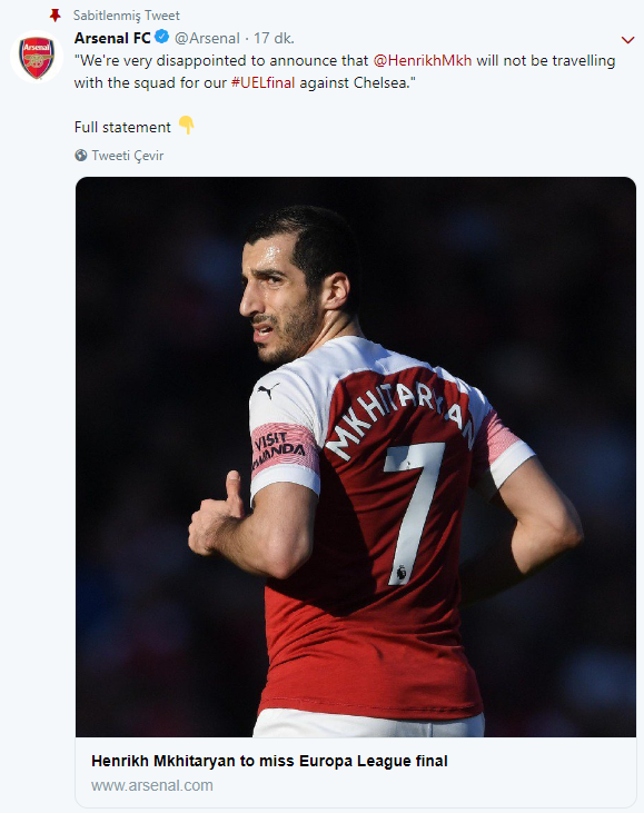 Arsenal, UEFA Avrupa Ligi finalinde Ermeni futbolcusu Henrikh Mkhitaryan'ın forma giyemeyeceğini duyurdu.