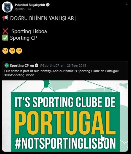 20 Şubat Perşembe günü saat 20.55'te Sporting CP ile karşılaşacak olan Başakşehir, rakibinin kulüp adıyla ilgili hassasiyetine destek verdi. Medipol Başakşehir, Portekiz Ligi ekibinin sosyal hesabından yaptığı paylaşımı bir kez daha gündeme getirdi.