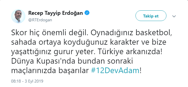 Gösterdikleri mücadeleden ötürü tüm takımı kutlayan Erdoğan, "Skor hiç önemli değil. Oynadığınız basketbol, sahada ortaya koyduğunuz karakter ve bize yaşattığınız gurur yeter. Türkiye arkanızda! Dünya Kupası'nda bundan sonraki maçlarınızda başarılar #12DevAdam!" notunu düştü.