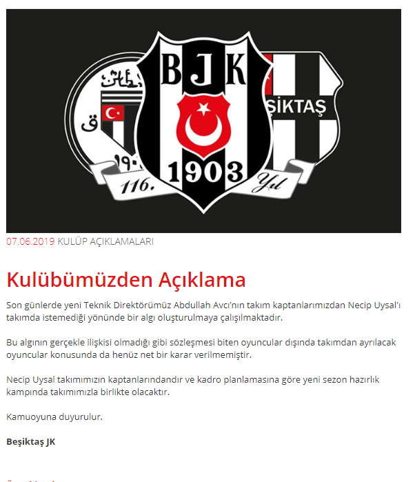 "Son günlerde yeni Teknik Direktörümüz Abdullah Avcı'nın takım kaptanlarımızdan Necip Uysal'ı takımda istemediği yönünde bir algı oluşturulmaya çalışılmaktadır.
