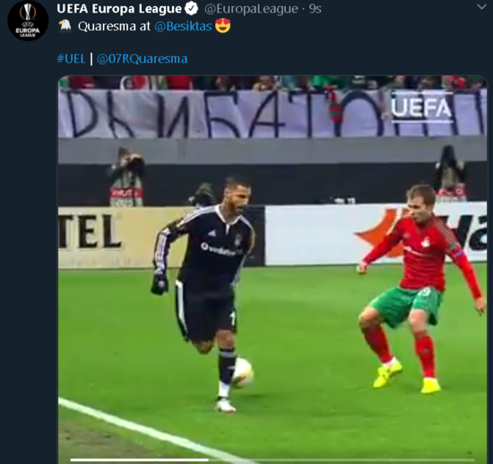 UEFA Avrupa Ligi'nin resmi twitter hesabı, Quaresma ve Beşiktaş birlikteliğini unutmadı. Ligin sosyal medya hesabından Portekizli yıldızın, siyah-beyazlı formayla yaptığı birbirinden güzel hareketler paylaşıldı. Eski başkan Fikret Orman ile yaşadığı problemin ardından sezon başı Kasımpaşa'ya giden Q7 ile ilgili bu paylaşım binlerce beğeni aldı.
