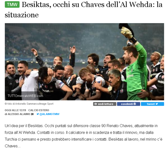 Haberde, 2021 yılında sözleşmesi sona erecek olan Chaves için Beşiktaş'ın nabız yokladığı belirtilirken, yakın zamanda temaslarını sıklaştıracağı öne sürüldü.