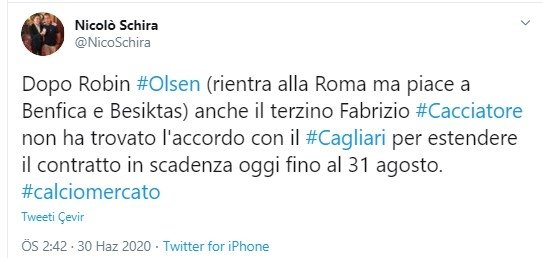 Schira, paylaştığı bilgiyle beraber, Robin Olsen'e Beşiktaş ve Benfica'nın ilgisinin olduğunu, 'Olsen Roma'ya döndü, Beşiktaş ve Benfica buna sevindi' notuyla duyurdu.