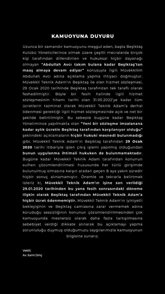 Abdullah Avcı hakkında çıkan iddiaları sosyal medyadan yaptığı açıklamayla yalanlayan Dinç, "Müvekkil teknik adamın işine son verildiği 29.01.2020 tarihinden bu yana fesih sonrasındaki döneme ilişkin olarak Beşiktaş tarafından müvekkil teknik adama hiçbir ücret ödenmemiştir." ifadesini kullandı.