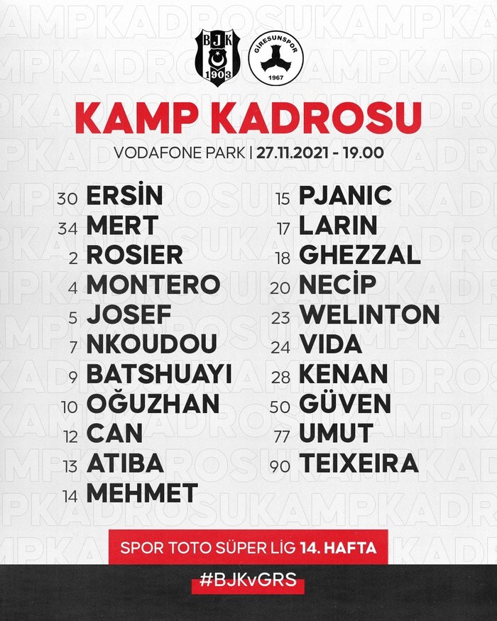 27 Kasım Cumartesi günü oynanacak olan karşılaşma önmcesi kamp kadrosu açıklandı. Rıdvan Yılmaz, Salih Uçan, Gökhan Töre ve Serdar Saatçi, Beşiktaş'ın Giresunspor maçı kadrosuna alınmadı.