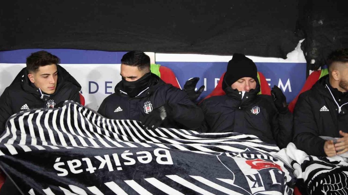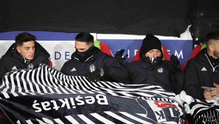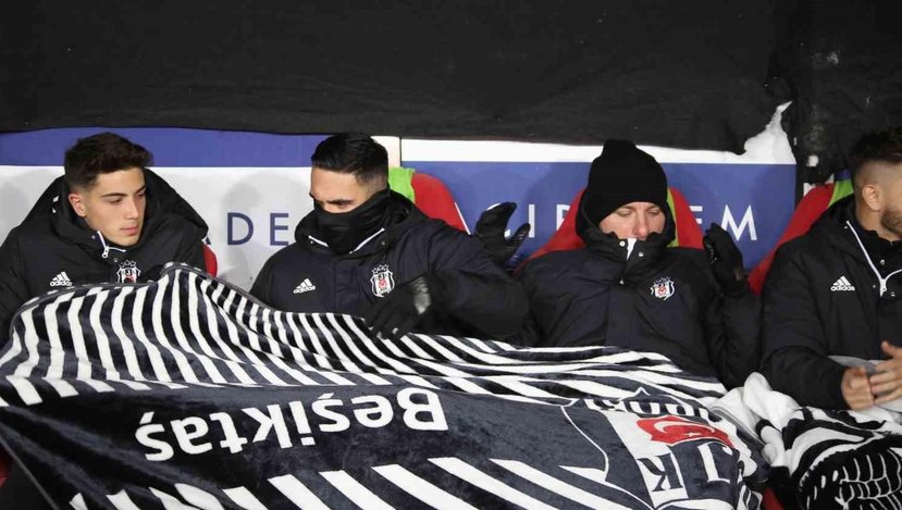 Bu arada yedek kulübesinde oturan futbolcular ise battaniyelere sarılarak soğuktan korundu.