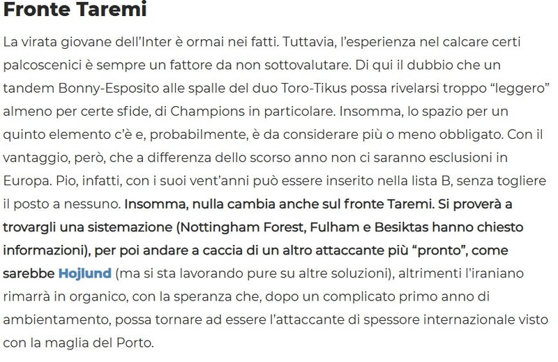 İtalyan basınından Corrierra Dello Sport'un haberine göre Inter Beşiktaş'ın ilgilendiği Mehdi Taremi'yle yolları bir an önce ayırmak istiyor. Aynı zamanda İranlı golcü siyah-beyazlı formayı giymeye sıcak bakıyor. Siyah-beyazlı yönetim, İranlı golcünün kulübüyle 2 yıllık sözleşmesi bulunmasına rağmen bedelsiz olarak takımdan ayrılabileceği bilgisine ulaştı.