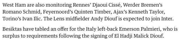 The Guardian'ın haberine göre Beşiktaş, Premier League temsilcisi West Ham United'ın İtalyan sol beki Emerson Palmieri için resmi teklif yaptı. Haberde, geçtiğimiz günlerde El Hadji Malick Diouf'u kadrosuna katan West Ham'ın Palmieri'yi gözden çıkardığı ve oyuncunun ayrılığına sıcak baktığı kaydedildi.