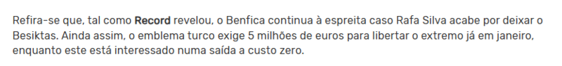 Portekiz basınından Record'un haberine göre siyah-beyazlı yönetim, Rafa Silva'nın serbest kalmasına onay vermek için 5 milyon euro bonservis bedeli talep ediyor. Ancak oyuncunun tarafı bu bedeli ödemeye yanaşmıyor.