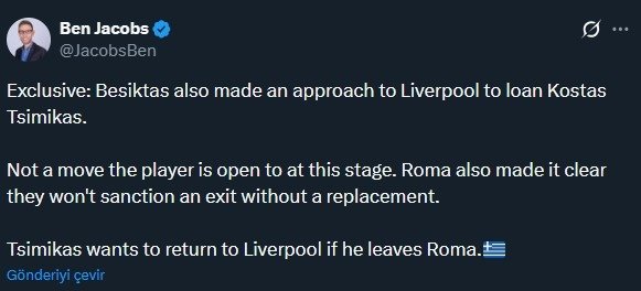GiveMeSport muhabiri Ben Jacobs'un haberine göre, 29 yaşındaki futbolcu şu an Beşiktaş'a gelmeye sıcak bakmıyor. Roma'nın da Tsimikas'ın yerine bir oyuncu alınmadan ayrılığa izin vermeyeceği öğrenildi.