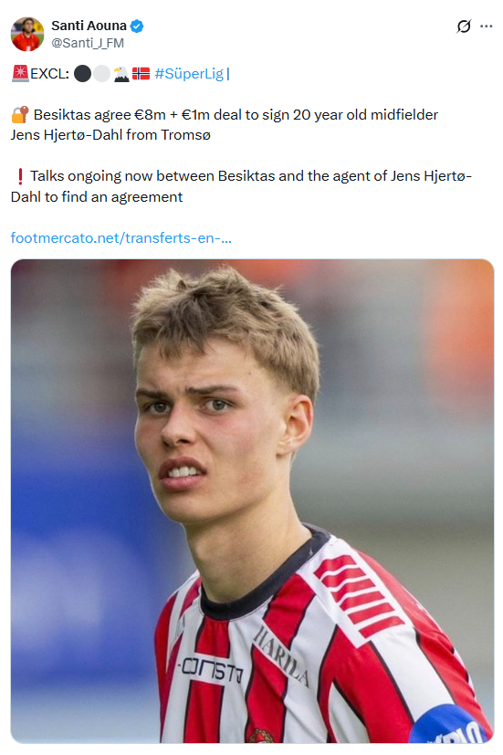Foot Mercato'dan Santi Aouna'nın haberine göre Beşiktaş, 20 yaşındaki orta saha oyuncusu Jens Hjertø-Dahl'ı Tromsø'dan transfer etmek için 8 milyon euro + 1 milyon euro bonus içeren bir anlaşmaya vardı.