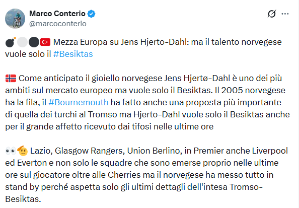 Öte yandan genç oyuncunun transferine dair flaş bir gelişme yaşandı. Gazeteci Marco Conterio'nun haberine göre; Jens Hjerto-Dahl'ın birçok önemli kulübü reddederek Beşiktaş'a gitmek istediği öğrenildi.