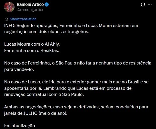 Brezilya basınından Ramoni Artico'nun haberine göre siyah-beyazlılar, Sao Paulo forması giyen Ferreirinha ile transfer görüşmeleri yürütüyor.
