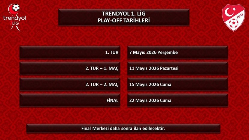 Türkiye Futbol Federasyonu (TFF), Trendyol 1. Lig, 2. Lig ve 3. Lig'de play-off tarihlerinin belirlendiğini açıkladı. Açıklamada tarafsız şehirlerde oynanacak final müsabakalarının merkezlerin daha sonra ilan edileceği belirtildi. Play-offlar 23 Nisan'da başlayacak. Trendyol 1., 2. ve 3. Lig'de play off tarihleri şu şekilde: