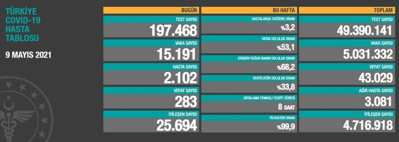 Bakan Koca 9 Mayıs günü 15 bin 191 vakaya rastlandığını açıkladı.