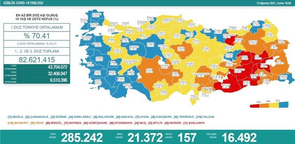 Bakan Koca 13 Ağustos Cuma günü 21 bin 372 vakaya rastlandığını açıkladı. Koca ayrıca 157 vatandaşımızın hayatını kaybettiğini açıkladı.