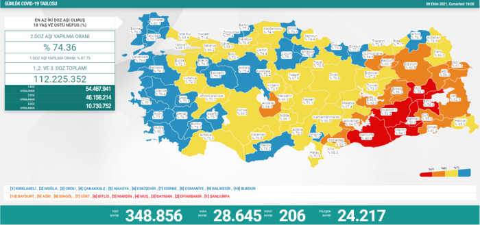 Bakan Koca 9 Ekim 2021 Cumartesi günü 28 bin 645 vakaya rastlandığını açıkladı. Koca ayrıca 206 vatandaşımızın hayatını kaybettiğini açıkladı.