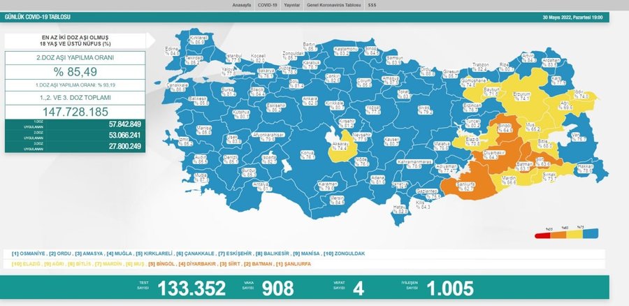 Bakan Koca 30 Mayıs 2022 Pazartesi günü 908 vakaya rastlandığını açıkladı. Koca ayrıca 4 vatandaşımızın hayatını kaybettiğini açıkladı.