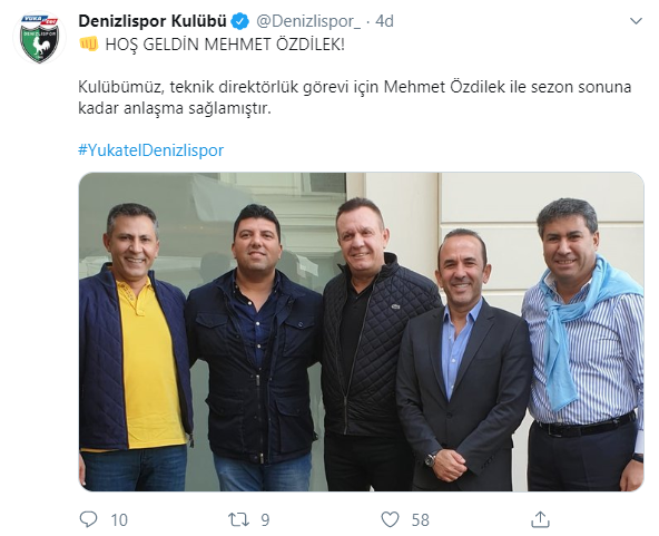 Yukatel Denizlispor, Mehmet Özdilek ile anlaşma sağladıklarını resmi Twitter hesabından duyurdu. Yapılan paylaşımda, "Kulübümüz, teknik direktörlük görevi için Mehmet Özdilek ile sezon sonuna kadar anlaşma sağlamıştır." ifadelerine yer verildi.