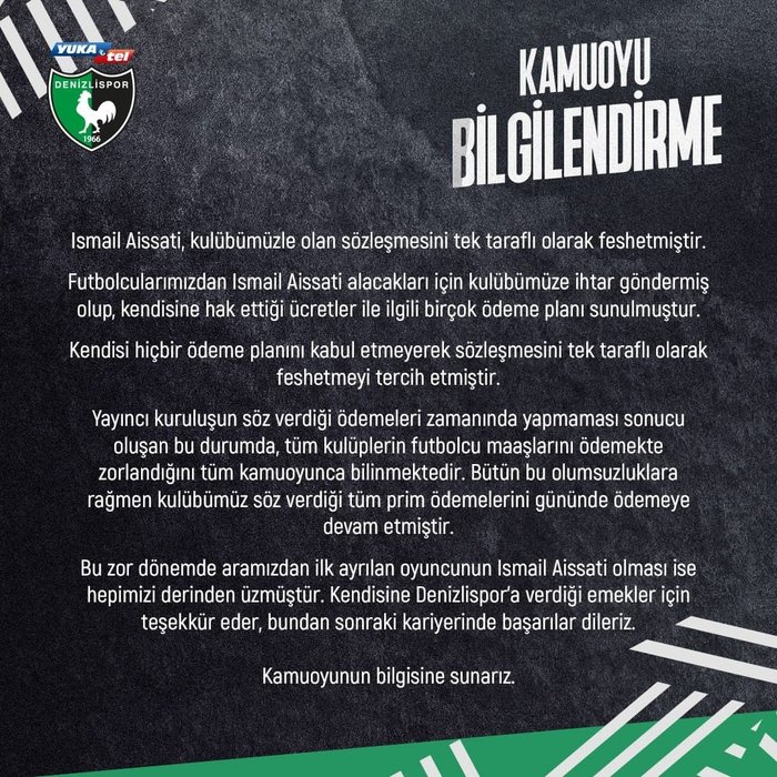Yukatel Denizlispor, 32 yaşındaki Hollandalı orta saha oyuncusu Ismail Aissati ile yollarını ayırdı. Denizlispor kulübü resmi sosyal medya hesabı üzerinden yaptığı paylaşımla ayrılığı duyurdu. Tecrübeli oyuncu Türkiye'de daha önce Antalyaspor, Alanyaspor ve Balıkesirspor formaları giymiş, 2018 yılında 60 bin Euro bonservis bedeliyle Denizlispor'a imza atmıştı.