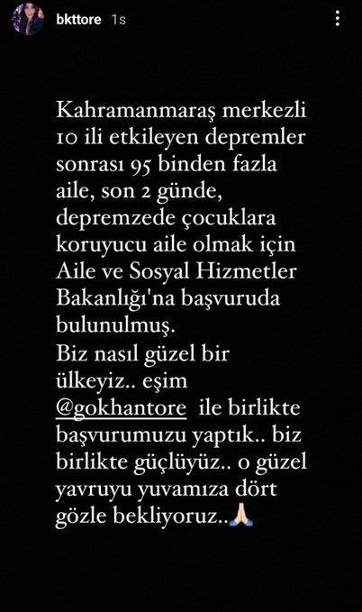 Buket Töre sosyal medya hesabından yaptığı paylaşımda, "Kahramanmaraş merkezli 10 ili etkileyen depremler sonrası 95 binden fazla aile, son 2 günde, depremzede çocuklara koruyucu aile olmak için Aile ve Sosyal Hizmetler Bakanlığı'na başvuruda bulunulmuş. Biz nasıl güzel bir ülkeyiz... Eşim Gökhan Töre ile birlikte başvurumuzu yaptık. Biz birlikte güçlüyüz... O güzel yavruyu yuvamıza dört gözle bekliyoruz" ifadelerini kullandı.