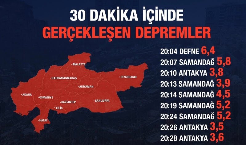 AFAD: "Hatay ili Defne ilçesinde saat 20.04'te 6.4 büyüklüğünde bir deprem meydana gelmiştir. Deprem sonrası, en büyüğü 5,8 olmak üzere, 32 artçı deprem yaşanmıştır. Deprem nedeniyle üç vatandaşımız hayatını kaybetmiş, 213 vatandaşımız çevredeki hastanelere nakledilmiştir."