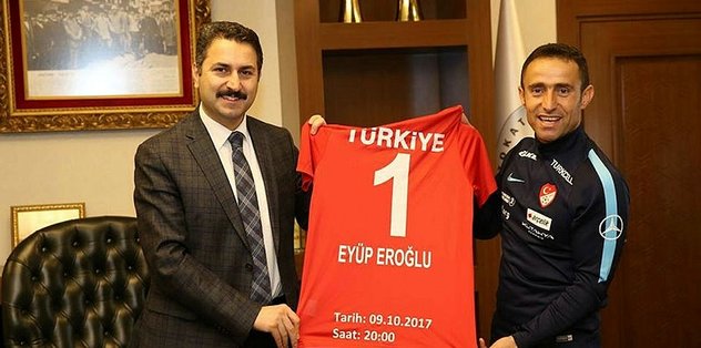 Başkan Eroğlu, Gazi Çakmak'ı altınla ödüllendirirken, Çakmak da Başkan Eroğlu'na forma hediye etti.