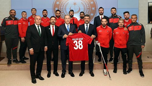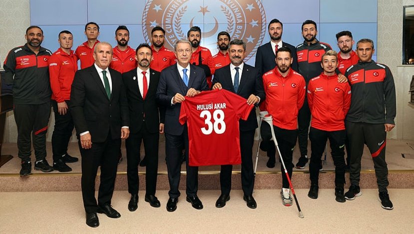 Milli Savunma Bakanı Hulusi Akar, İstanbul'daki Ampute Futbol Dünya Kupası'nda şampiyon olan milli takımla bir araya geldi. Kabulde, Türkiye Bedensel Engelliler Spor Federasyonu Başkanı (TBESF) Muaz Ergezen, Ampute Milli Takımı Teknik Direktörü Osman Çakmak ve milli futbolcuların yanı sıra yöneticiler yer aldı. Bakan Akar, şampiyonluklarından dolayı milli sporcuları kutladı. Ardından futbolcular, 38 numaralı milli takım formasını Bakan Akar'a hediye etti.