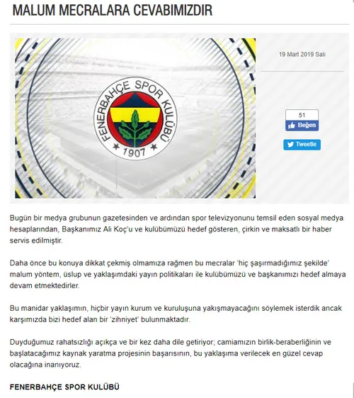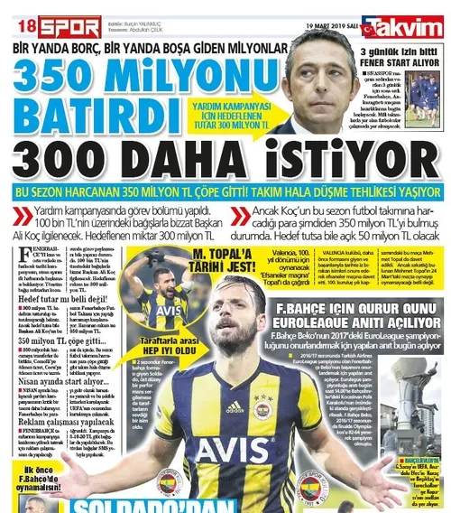 AKVİM gazetesinin 19 Mart tarihli sayfasında "350 milyonu batırdı. 300 daha istiyor" başlıklı habere dün Fenerbahçe resmi sitesinden tepki geldi. Cevap metninde, yapılan haberin kulübü hedef gösteren maksatlı bir metin olduğu iddia edildi. Aynı zamanda "Yakışmayacak söylem" ifadelerine de yer verildi.TAKVİM'İN VERDİĞİ RAKAM DOĞRU