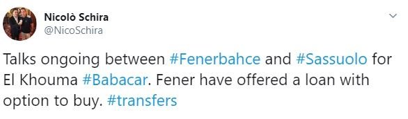 Süper Lig'de alternatifli kadro kurmak için çalışmalarını sürdüren Fenerbahçe'de son hamle Beşiktaş'ın da transfer listesinde bulunan Babacar oldu. İtalyan gazeteci Nicolo Shira'nın haberine göre sarı-lacivertli ekip Sassuolo'nun golcüsü Khouma Babacar için satın alma opsiyonlu kiralama teklifini iletti.