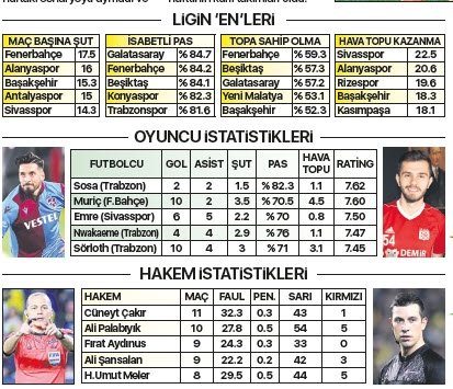 Galatasaray ise iki haftada 5. puanını İzmir'de kaybetti. Göztepe önünde gol kaçırma yarışına giren Cimbom, kazanacağı maçtan yenilgiyle ayrılıp, şampiyonluk yarışında ağır bir yara daha aldı. Trabzonspor bu sefer geçen haftaki senaryoya uymadı ve Beşiktaş ve G.Saray'ın kaybettiği haftada Konya'da Norveçli golcüsü Sörloth'la fırsatı değerlendirdi. Sivas, ilk yarı liderliğini Yatabare'nin 90+7'deki röveşatasıyla garantiledi. Başakşehir, Alanya, Göztepe, G.Antep ve Rizespor haftanın karlı takımları oldu.