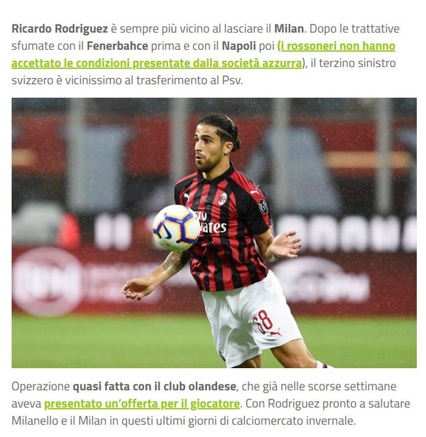 Ara transfer döneminin en çok konuşulan isimlerinden biri olan Ricardo Rodriguez kulübü Milan'dan ayrılmaya hazırlanıyor. Son olarak İtalyan devinin Torino'la oynadığı karşılaşmada kadroya alınmayan 27 yaşındaki futbolcu, takımıyla son günlerini yaşıyor. İtalya'nın önde gelen gazetecilerinden Di Marzio'nun haberine göre, Milan, Napoli'nin Ricardo Rodriguez teklifini reddetti. Fenerbahçe'nin harcama limitleri sebebiyle transferini sonuçlandıramadığı Ricardo Rodriguez, son görüşmelerden sonra Hollanda'nın PSV ekibine artık çok yakın...
