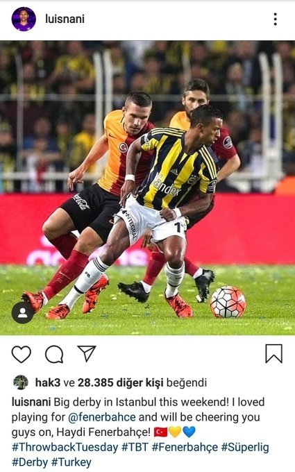 Yıldız futbolcu Luis Nani'den derbi paylaşımı geldi. Bir dönem Fenerbahçe forması giyen ve Galatasaray derbisi heyecanını yaşamış isimlerden biri olan Portekizli futbolcu, 23 Mart Pazar günkü derbi maçı için bir paylaşımda bulundu.