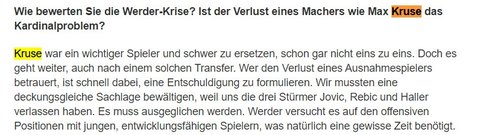 Hırvat futbol adamı, şu anda küme düşme tehlikesi yaşayan Werder'in, Max Kruse'yi aradığını ve onun yokluğunda yas tuttuğunu ifade ederken, "Kruse çok önemli bir oyuncuydu ve onun yokluğu zor. Böylesine istisnai bir oyuncunun kaybının ardından yas tutarsınız ve hızlı bir şekilde düzelmeye çalışırsınız. Biz de buna benzer bir durumla uğraşmak zorunda kaldık çünkü golcü Jovic, Rebic ve Haller bizi terk etti. Dengeli olması gerekiyor. Werder, zaman zaman genç ve dinamik oyuncuları forvet hattında deniyor." dedi.