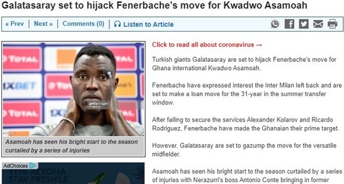 Gana medyasında yer alan habere göre, geçtiğimiz günlerde sezon sonunda Inter ile sözleşmesi sona erecek Kwadwo Asamoah için Fenerbahçe, devreye girmişti. FFP kısıtlaması nedeniyle maliyeti düşük ve takıma katkı verebilecek isimlere yönelen sarı lacivertliler, yıldız futbolcuyu kadrosuna katmak istiyordu.