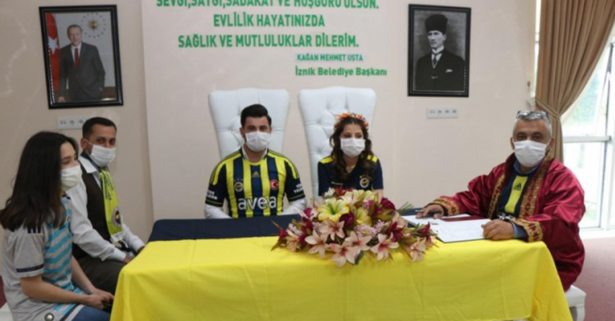 Bursa'nın İznik ilçesinde bir Fenerbahçeli çift fanatikliğini nikah masasına taşıdı. Gizem Çakır (22) ile İsmail Avşar (28), taraftarı oldukları Fenerbahçe formasıyla nikah masasına oturdu. 1 Haziran'da nikah masasına oturan genç çift, nikah memuru Önder Üncü'ye ve şahitlere de Fenerbahçe forması giydirdi.