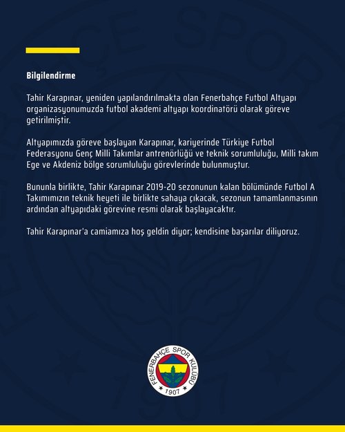 "Tahir Karapınar, yeniden yapılandırılmakta olan Fenerbahçe Futbol Altyapı organizasyonumuzda futbol akademi altyapı koordinatörü olarak göreve