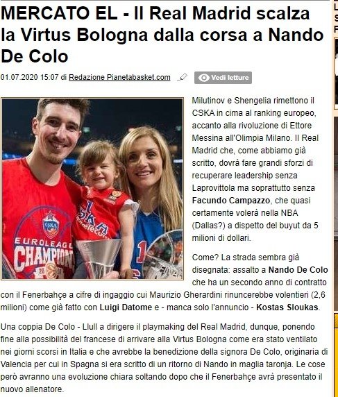 İtalyan basınının konu ile ilgili okuyucularına aktardığı haberde, oyuncunun daha önce CSKA'da harika işler yaptığı ifade etti ve Real Madrid'in, De Colo'yu Bologna'ya kaptırmak istemediğini dile getirdi.