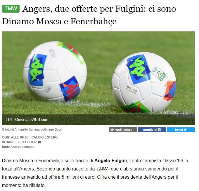 Tuttomercato'nun haberine göre şu anda Fransa Lig 1 ekibi Angers forması giyen Angelo Fulgini için Fenerbahçe ile beraber Dinamo Moskova da teklif yaptı.