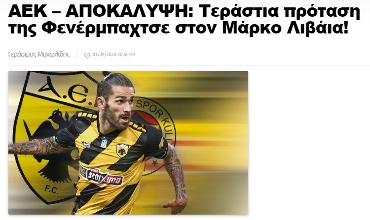 Yunan basınında yer alan bilgilere göre AEK, oyuncuya yeni sözleşme teklif edecek ancak Fenerbahçe, beklenmedik bir atak gerçekleştirdi ve yıldız futbolcunun menajerine teklifini iletti.